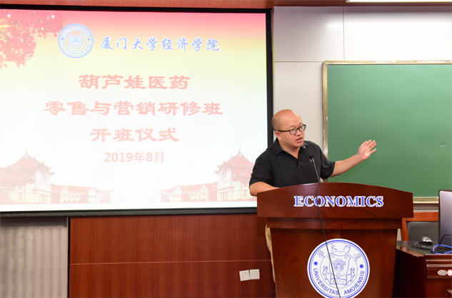 在开班仪式上,廖景峰主任首先代表厦门大学经济学院热烈欢迎william威廉医药零售与营销研修班的学员到厦大学习,并就厦门大学及经济学院的相关情况进行了介绍。他说,william威廉学员走进厦大就是厦大的校友,希望未来的日子能够关心、支持母校的发展,多提宝贵意见,同时他也祝大家在厦大学习期间学有所成、学有所获。